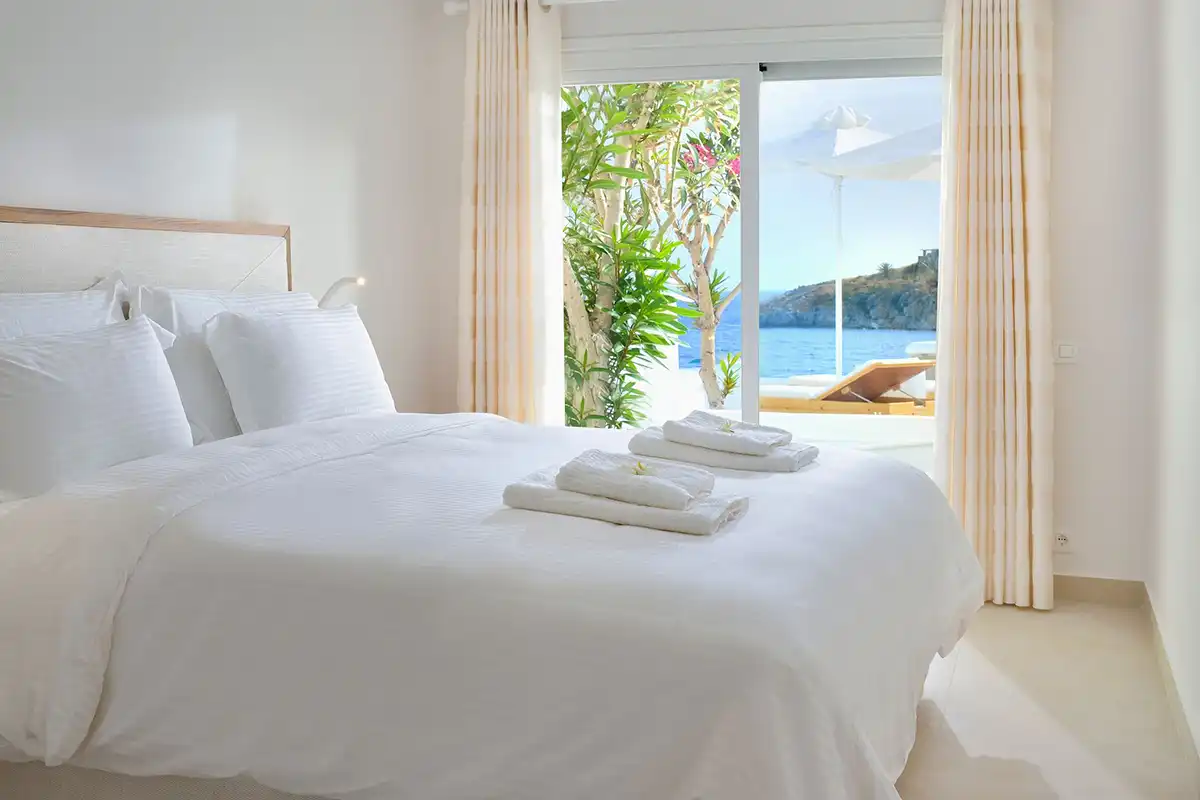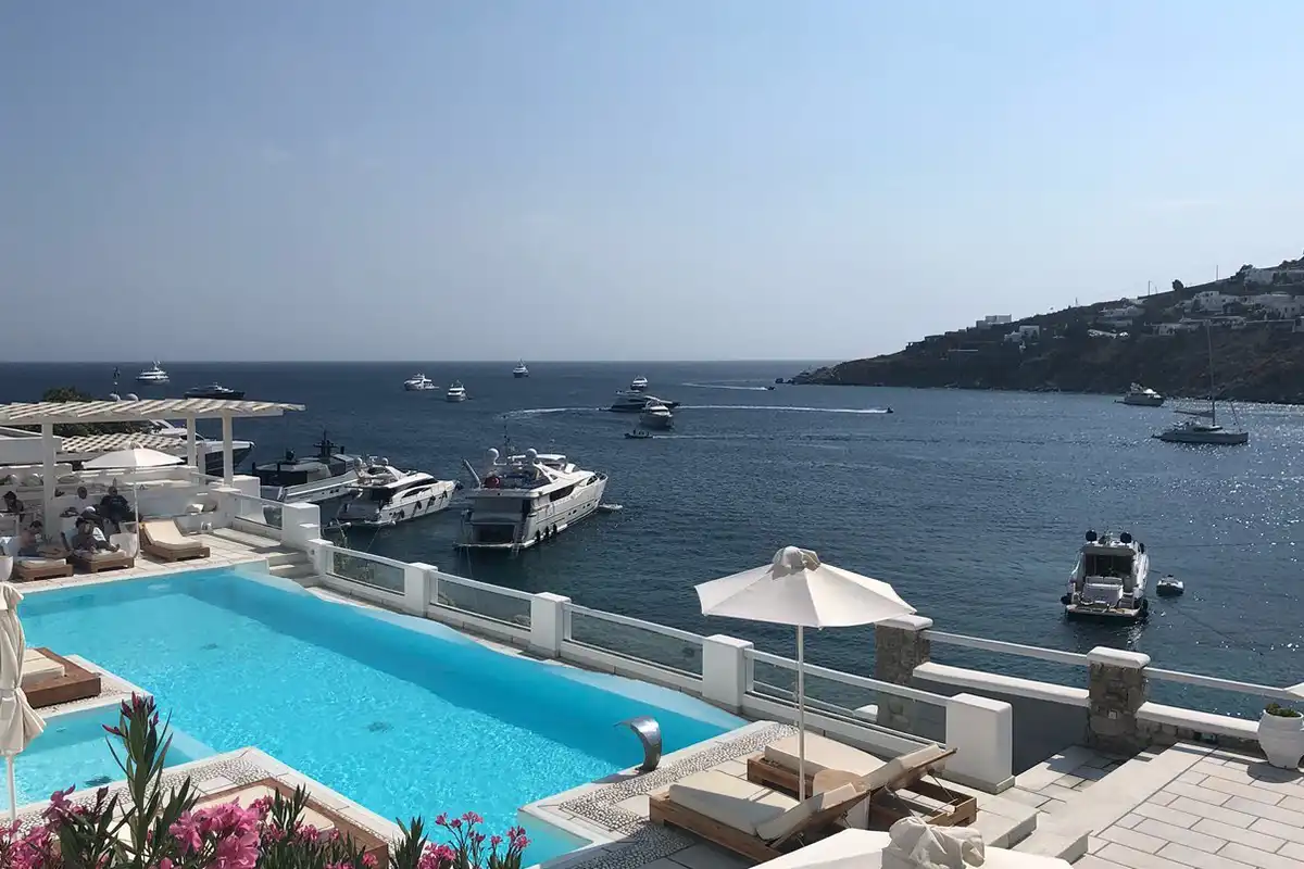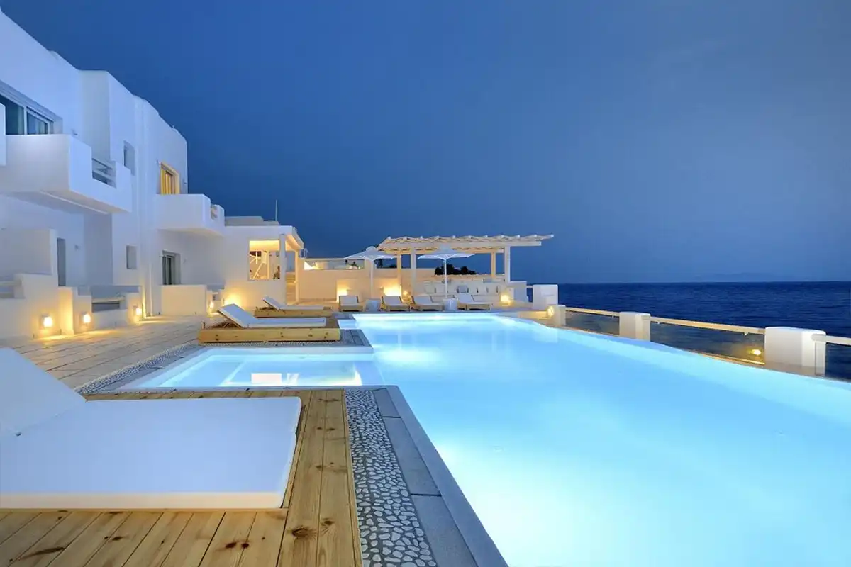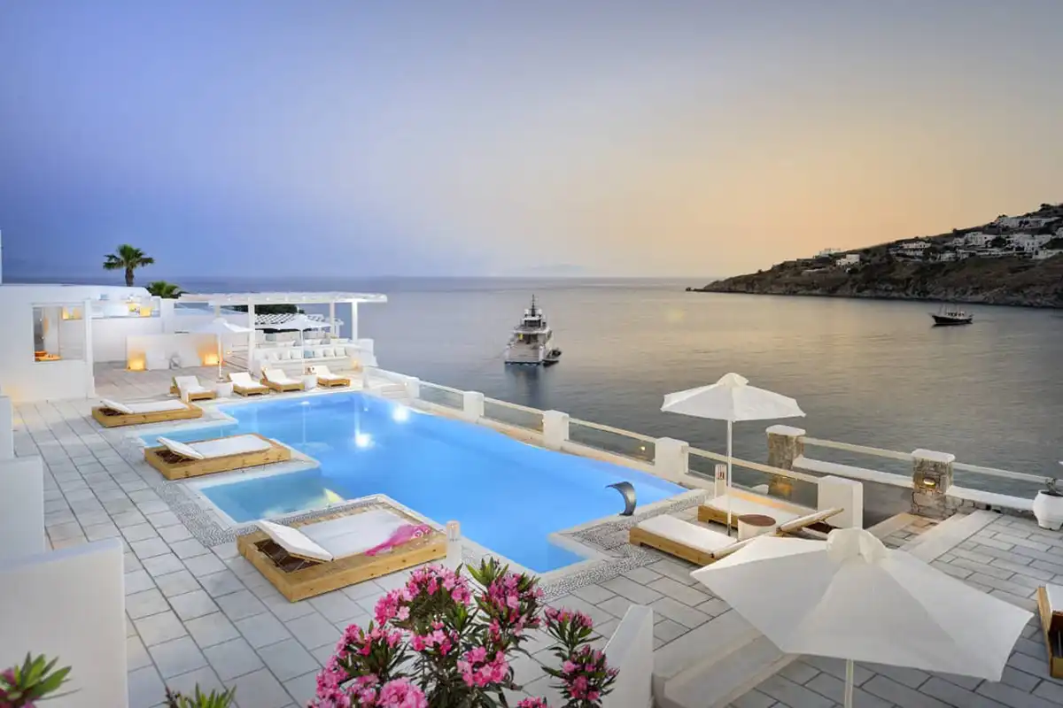 Your base, Nissaki Boutique Hotel, offers the perfect blend of serene luxury and iconic Mykonian style, with panoramic views across Psarou and Platis Gialos.