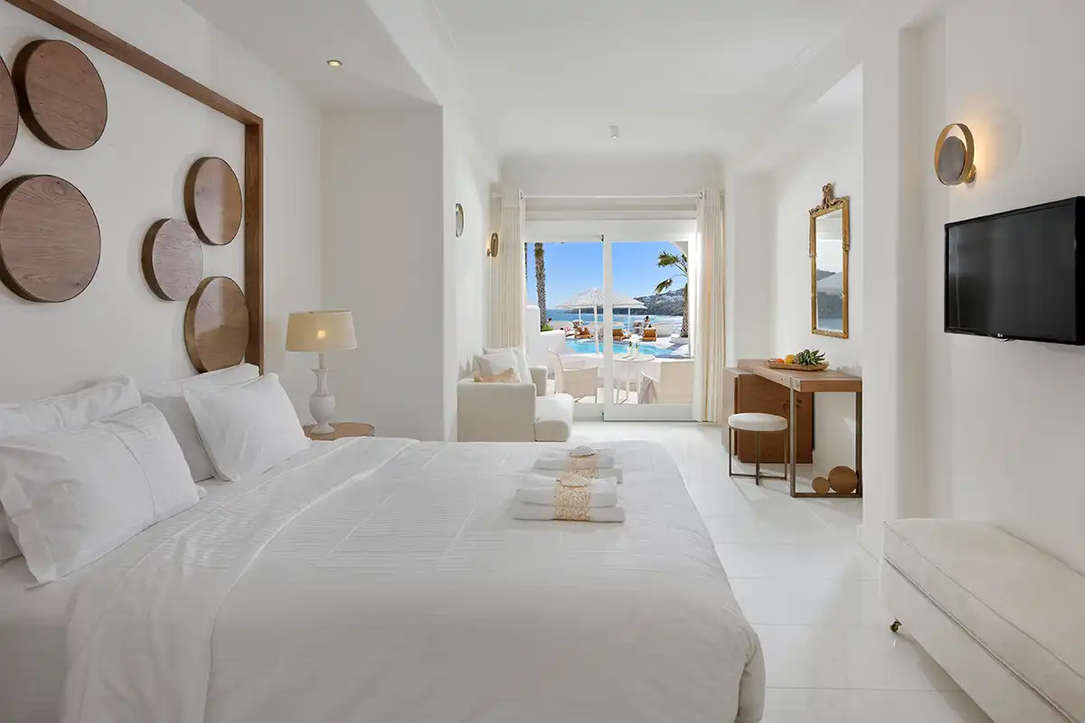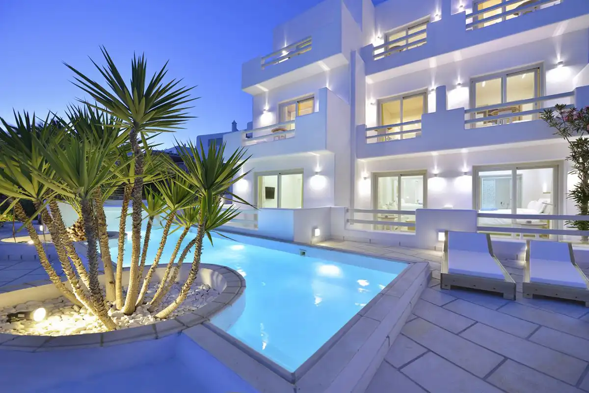 Swim in crystal-clear waters, relax on Psarou or Platis Gialos Beach, or lounge by the hotel’s elegant pools.