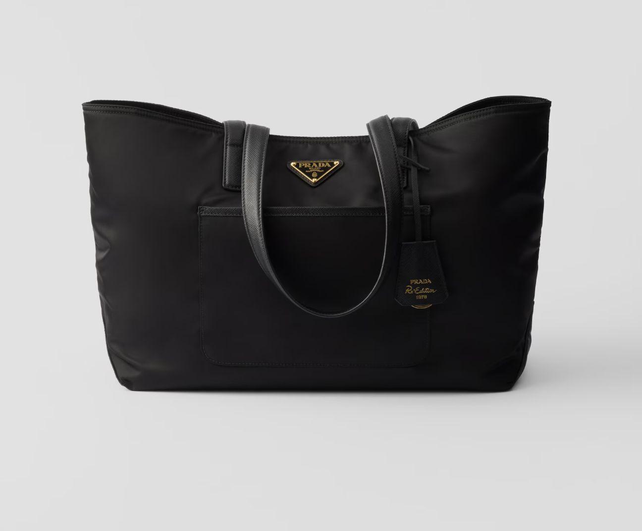 The Prada Medium Re-Nylon Re-Edition 1978 Tote Bag in black is a sustainable yet stylish piece from Prada’s Re-Nylon collection. It is made from regenerated nylon, reflecting the brand’s commitment to environmental responsibility. Featuring a sleek, minimalist design, the bag is spacious with a practical, functional shape. The tote includes a detachable leather keychain and comes in a variety of colors, with the iconic Prada logo displayed prominently.