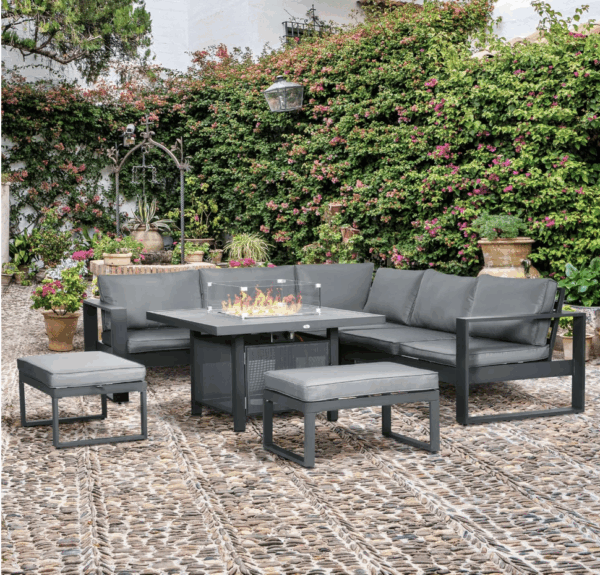 - Includes: – 2 x Loveseat – 1 x Corner Sofa – 2 x Footstools – 1 x Firepit Table – 7 x Seat Cushion – 6 x Back Cushion – 1 x Manual